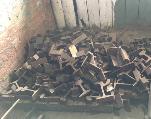 After reviewing this material, a possible explanation for them has emerged. The exact size and shape of the rail would determine the size and shape of the joint bars. While some customers had robust engineering departments that could provide suitable specifications for the needed bars, many did not. These customers simply sent a rail sample to RJC, who could then make joint bars guaranteed to fit that particular rail type. RJC took each sample and sawed a two-inch-thick section and punched identifying marks. These were accumulated over decades and probably kept so that subsequent repeat orders could be handled expeditiously.