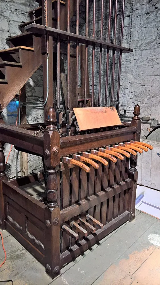 As a chimer Harrison played a set (or chime) of ten bells cast in 1874 totaling 10,109 pounds. The individual bells range in weight from 2,559 pounds to 237 pounds. At least one of the bells was a gift from the local Eckert family and bears an inscription. The bells were installed in the church steeple by West Troy Meneely’s rigger John O’Connell, and the order also included a chime stand. The cost in 1874 was $5,500. The same bells purchased today would cost $575,000.