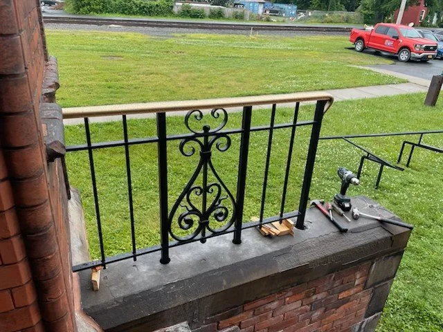 Decorative ironwork and a matching handrail for the paymaster step were recently completed and installed by Keicher Metal Arts of Cairo, New York, the same craftsmen who made the iron/brass railings and decorative ironwork for our front steps. Also, the great crew from Bunkoff General Contractors returned to address needed repairs to the exterior brick work. They have already made our building more secure and efficient; now they will make it more beautiful than ever.