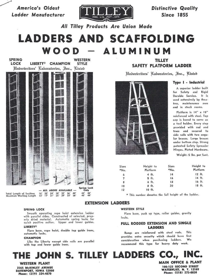 The Tilley Ladder Co., founded in Watervliet, New York, in 1855, was a major manufacturer of wooden and aluminum ladders and scaffolding for almost 150 years. It marketed its products across the U.S. and exported to several countries. It operated at two sites in Watervliet (or West Troy as it was throughout most of the 19th century). One site burned. The second site was converted into upscale apartments after the company closed in 2004.