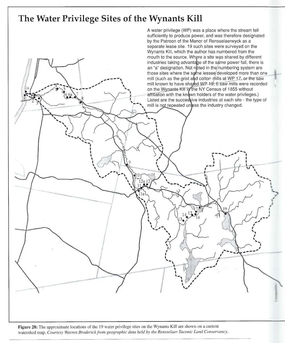The Poesten Kill is the more powerful of the two streams. The Wynants Kill, with a drainage area of only 29 square miles and a fall of 850 feet, is relatively feeble in comparison, and its flow was unpredictable. Consequently, in 1829 the owners of mills along the stream formed the Wynants Kill Association (renamed the Wynants Kill Improvement Association in 1901) with the intention of engineering the stream to provide a greater and more regular flow of water to power their enterprises.